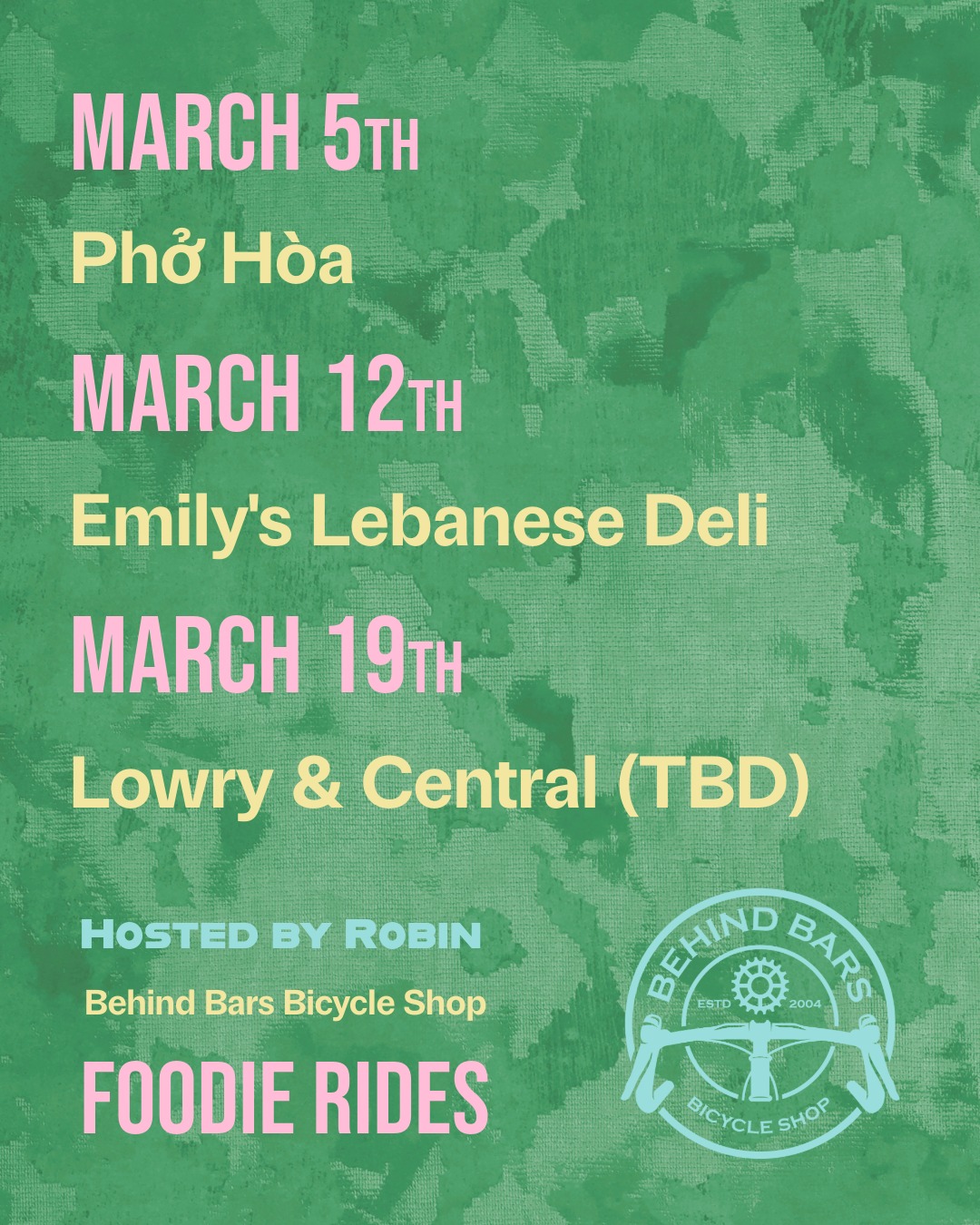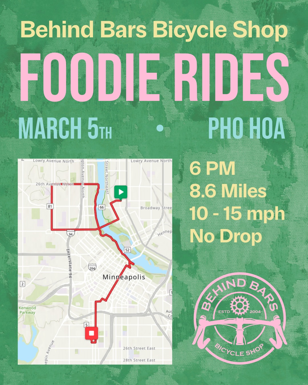 The route will feature a loop through North Minneapolis before heading down to Eat Street for Phở. These are no-drop rides, meaning we will stay together as a group.