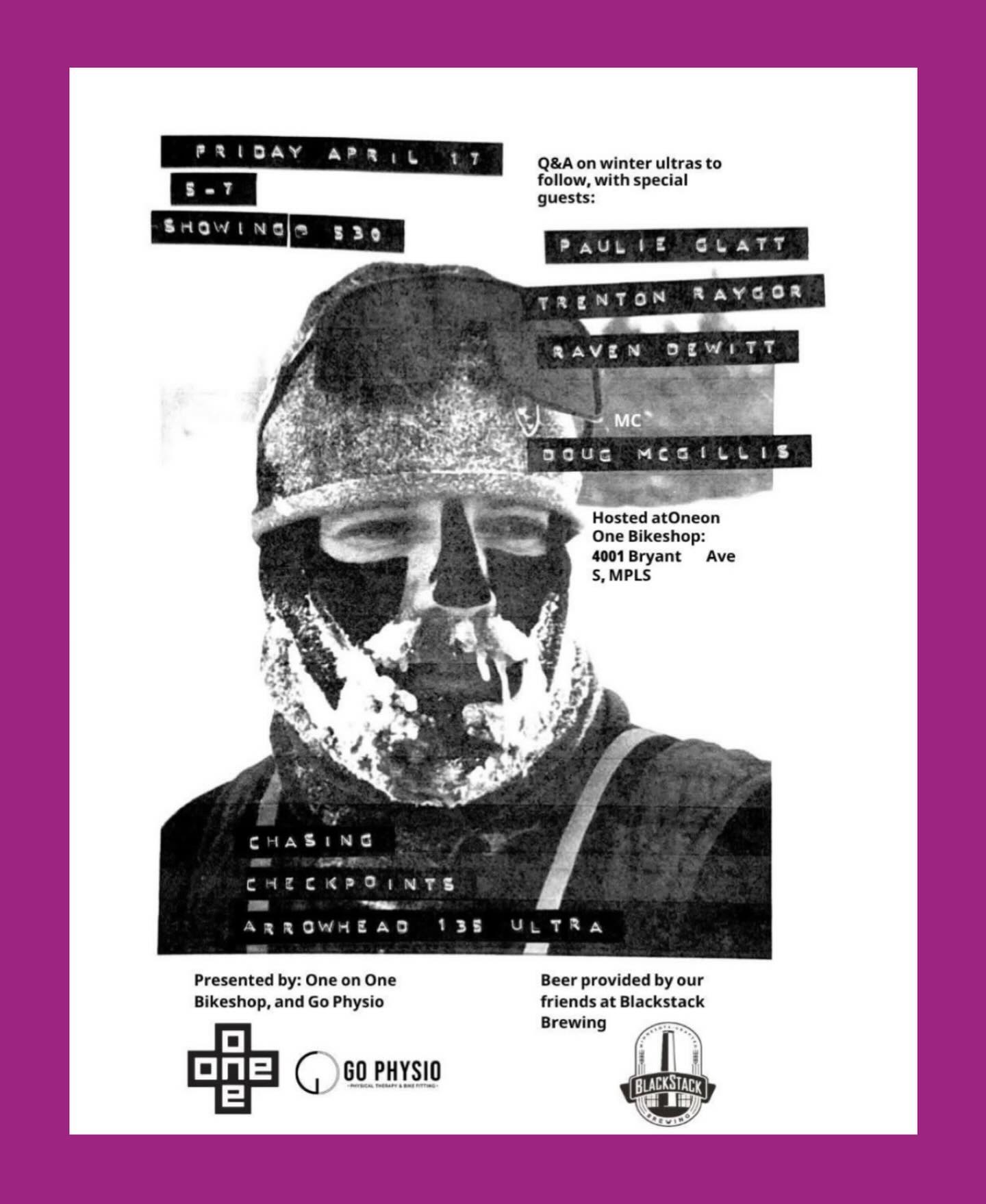 Group ride (no-drop) social ride to One on One Bicycle Studio for a film screening about Paulie Glatt's Arrowhead 135 experience.